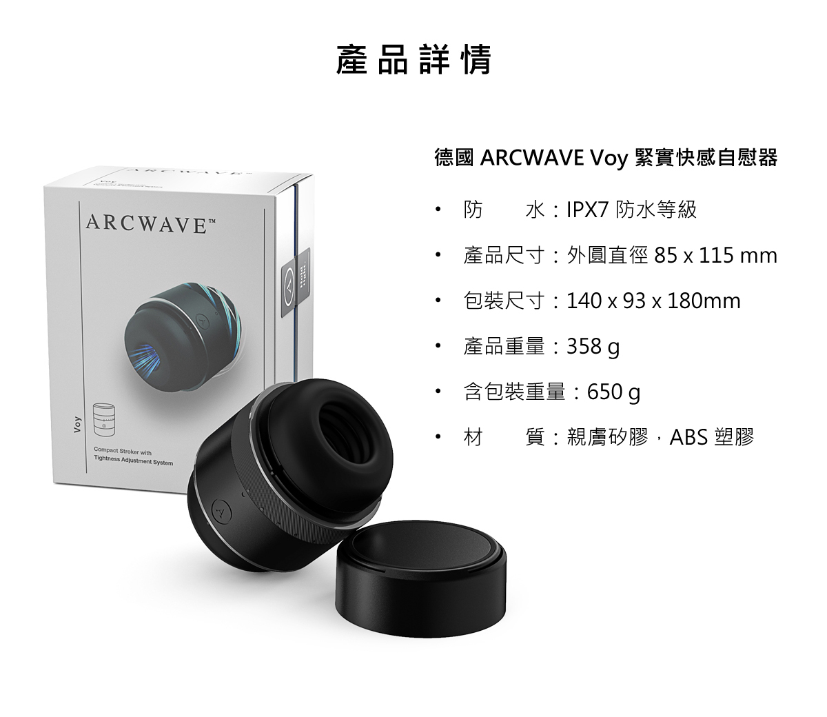 內容物: Voy 緊實快感自慰器、Arcwave 潤滑液 by Pjur 試用包10ml、 說明書